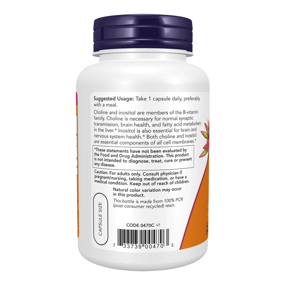NOW Foods Choline & Inositol - 100 cápsulas vegetales combina dos nutrientes esenciales del complejo B que apoyan la salud cerebral, el sistema nervioso y el metabolismo de las grasas. Choline e Inositol son componentes fundamentales de las membranas celulares y participan en procesos clave como la transmisión nerviosa y la función hepática.