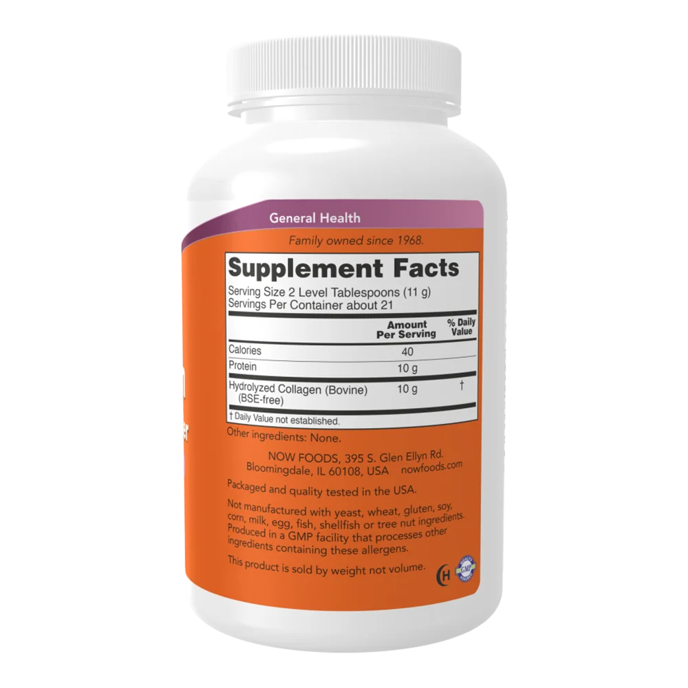 NOW Foods Collagen Peptides Powder - 227 g (8 oz) es un suplemento de colágeno hidrolizado de alta pureza, elaborado a partir de colágeno bovino tipo 1 y 3. Su formato en polvo se disuelve fácilmente en agua, café, batidos o cualquier bebida, aportando proteínas que apoyan la salud de la piel, articulaciones, huesos y tejidos conectivos.