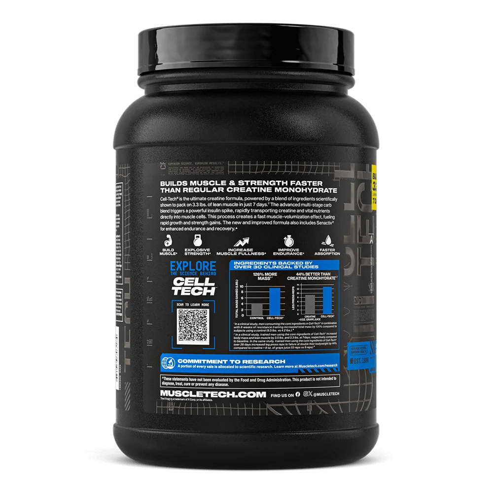 Cell-Tech® ofrece la combinación perfecta de componentes clave clínicamente probados para brindar resultados rápidos en fuerza y tamaño muscular.